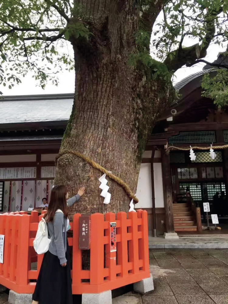 『犬夜叉』の中に、古い御神木が出てきました。それで宇佐神宮の御神木を見た時、かごめが初めて樹に封印された犬夜叉を見て、犬夜叉の犬のような耳を触るシーンが思い出されました。すごくワクワクして、友達に写真を撮ってもらいました。