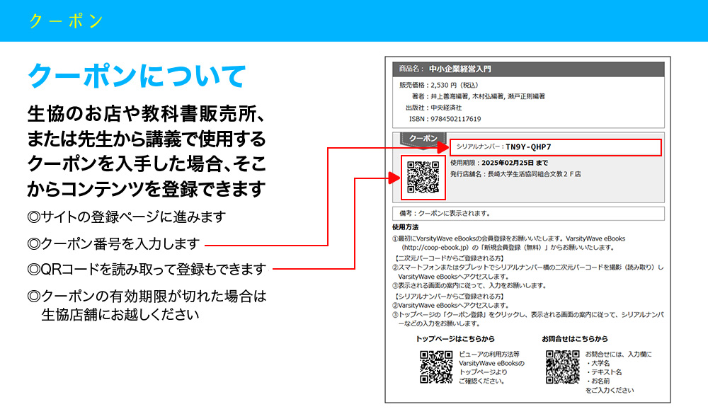 - 学⽣が電⼦教科書を準備するには、⽣協で販売されているクーポンを購⼊し、クーポンに記載されているシリアルコードを電⼦教科書販売サイト(VarsityWave eBooks)で⼊⼒すればOKです。